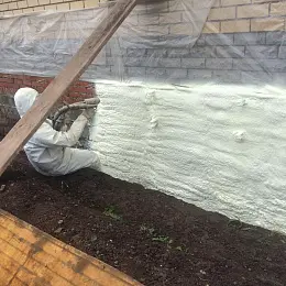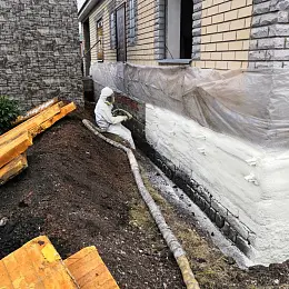 - Задача: напыление ППУ для утепления фундамента дома с последующей гидроизоляцией полиуретановой мастикой ручного нанесения